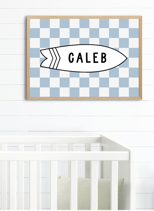 Personalized Name Surfboard Print (Checkered Blue)