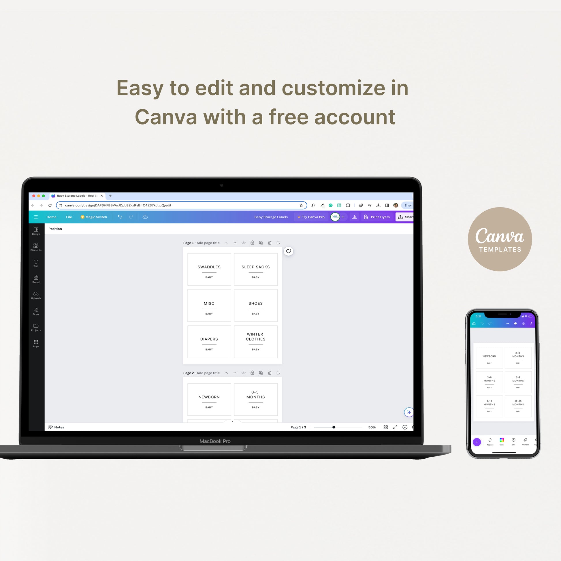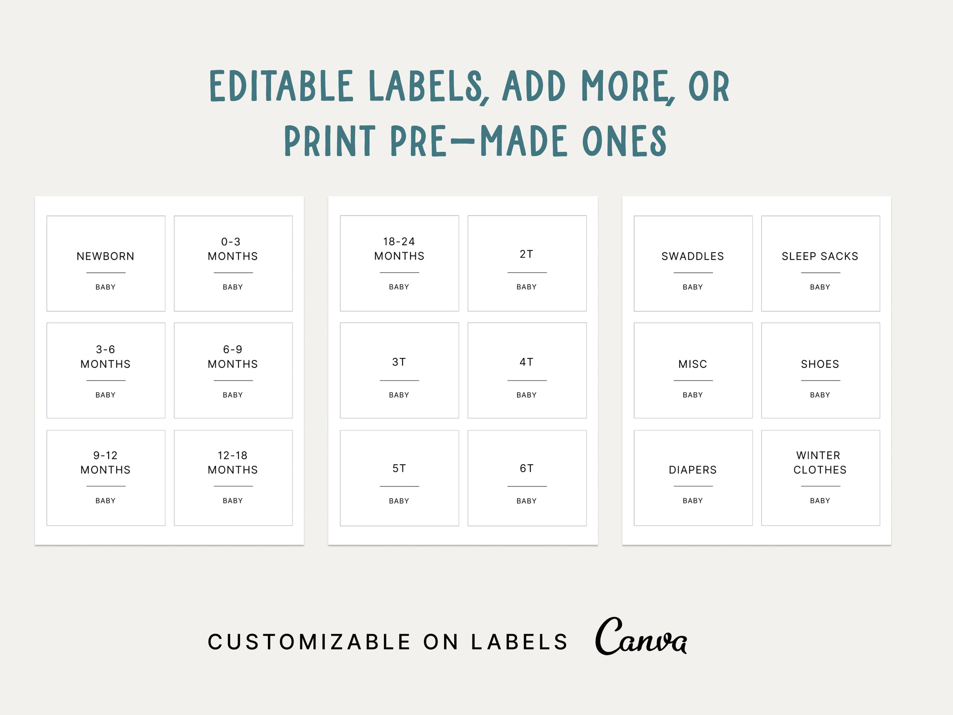 Editable and printable baby storage labels to organize your baby's clothes and keep track of the sizes in storage bins.
