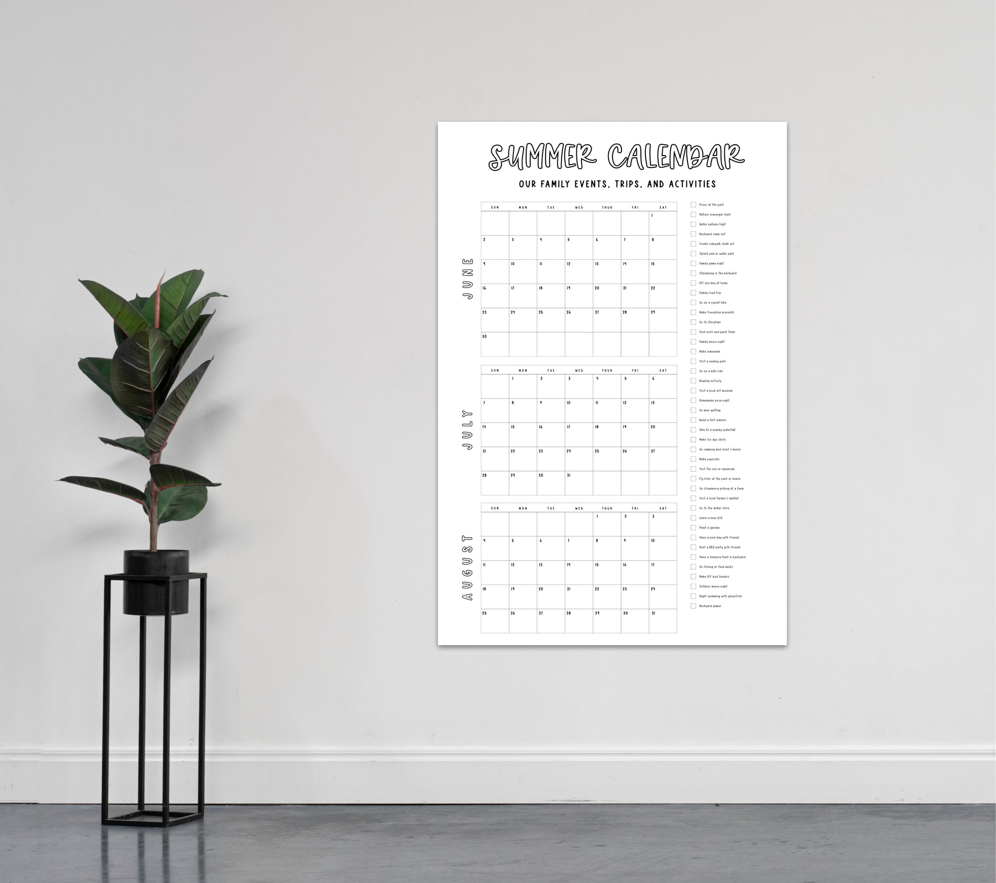 Want to create a fun summer filled with fun ideas, summer events, and trips? This classy and adorable calendar is perfect to keep all your summer plans organized and include some (or all) the fun summer bucklist ideas! This simple design will complement any room it's hanging in.
