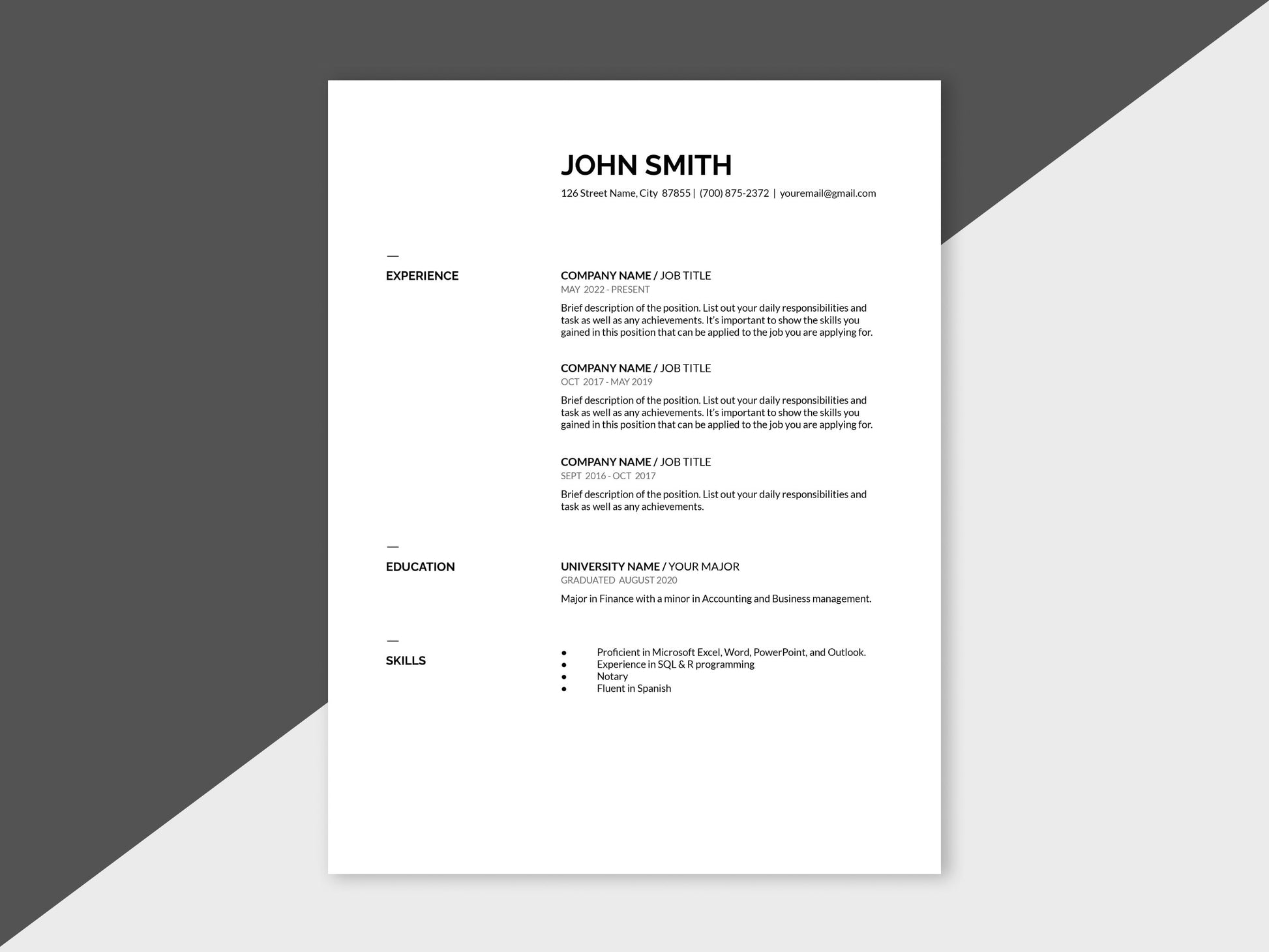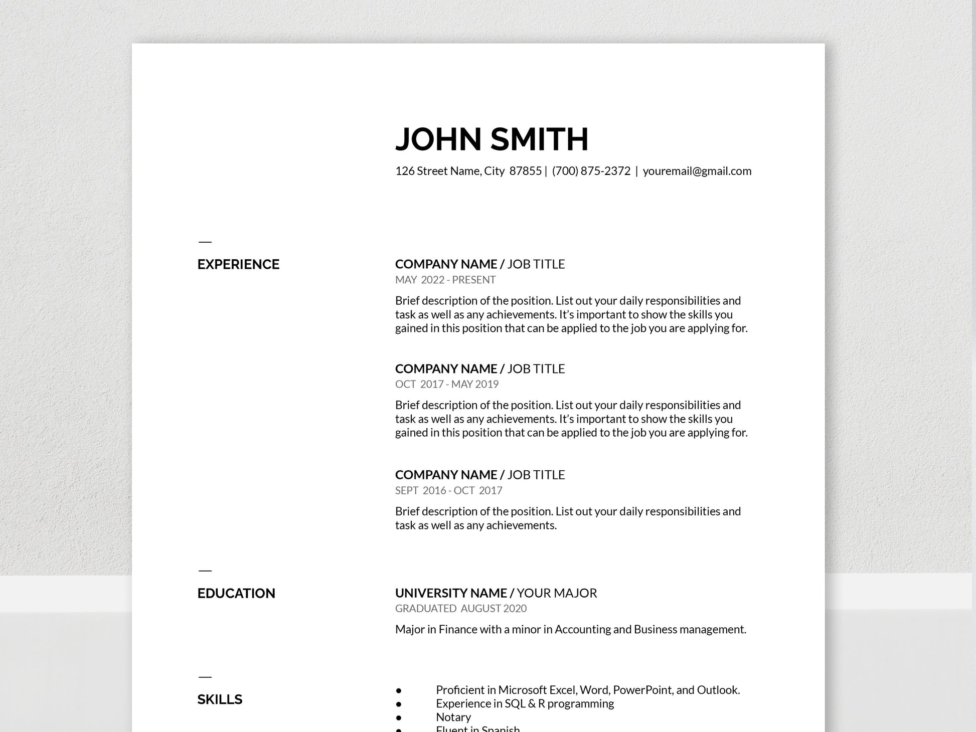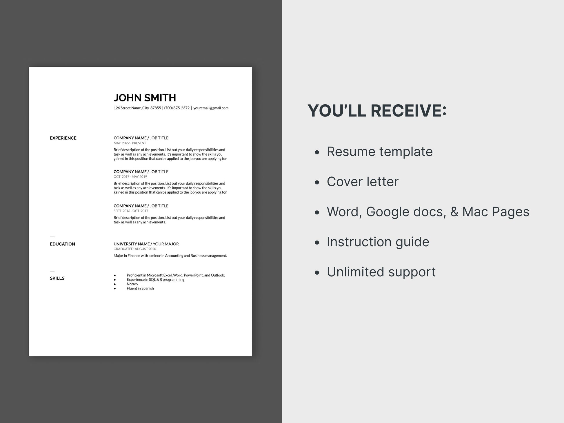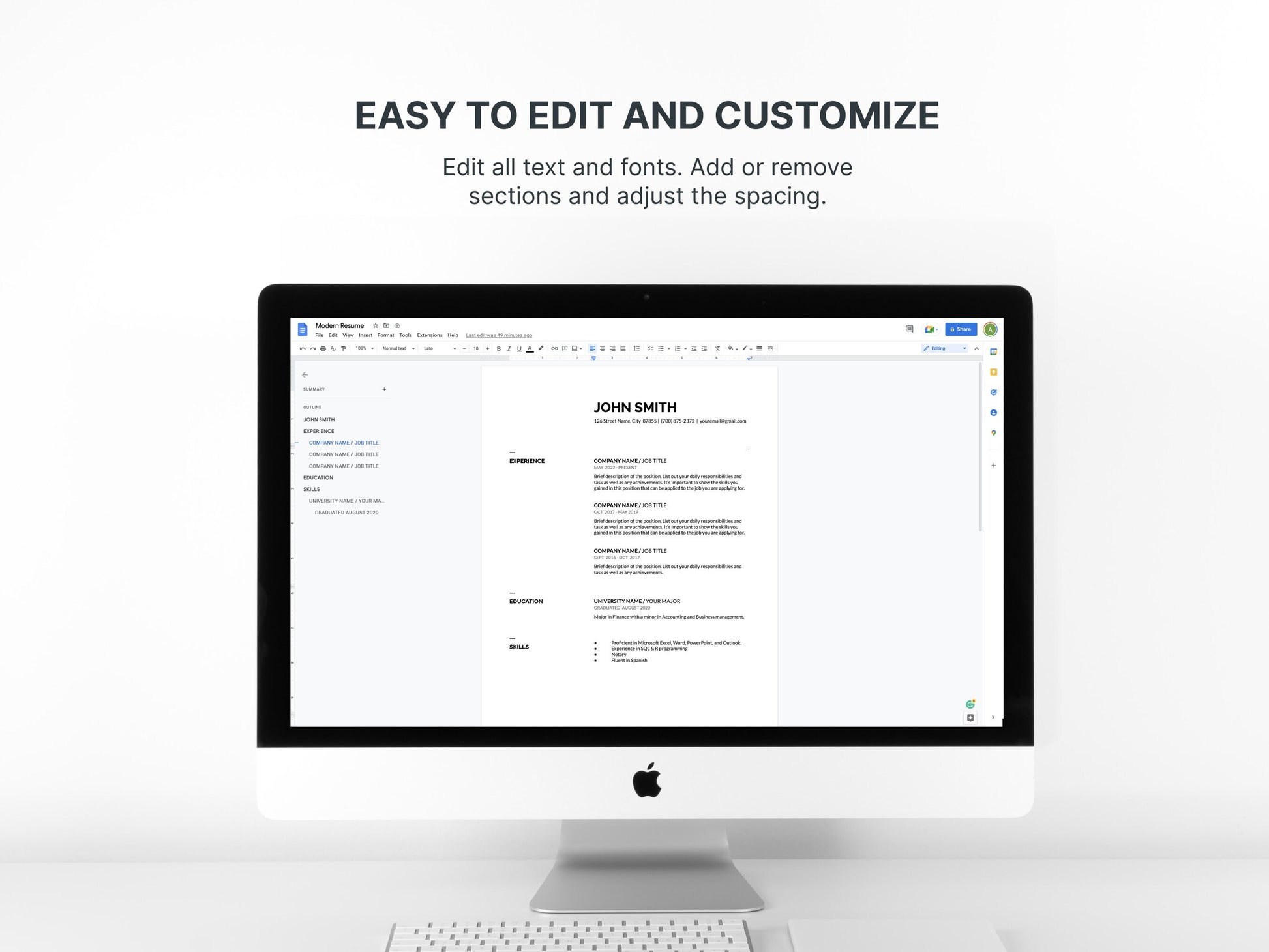 Easily update your resume to this modern and minimalist design. Everything is fully customized and can be edited on Google Docs, Apple Pages, or Microsoft Word.